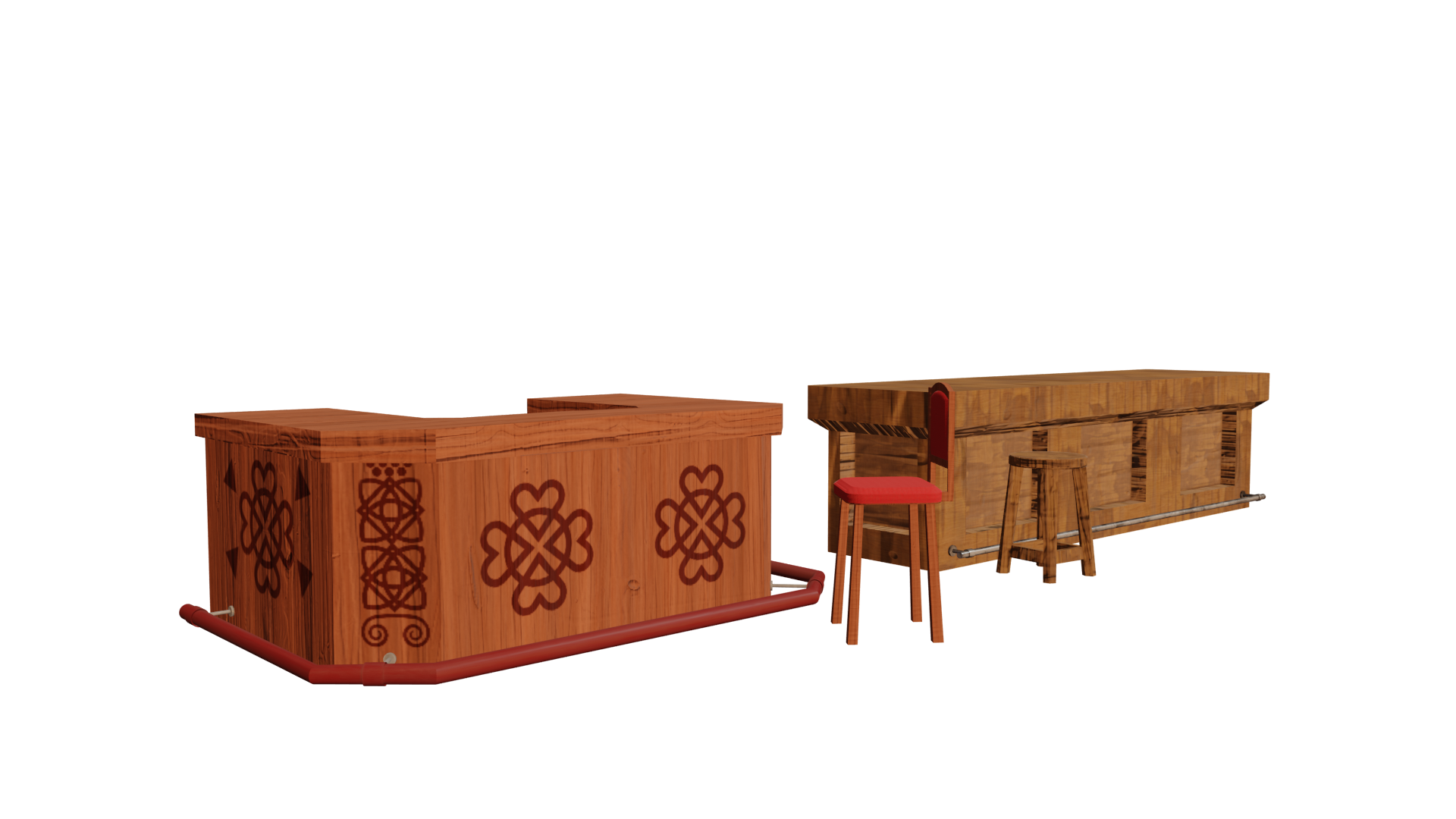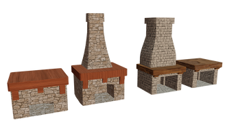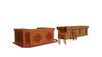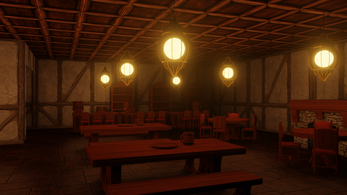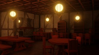 Includes: tables, chairs, benches, bar counters, mugs, plates, barrels, crates, hanging lanterns and fireplace